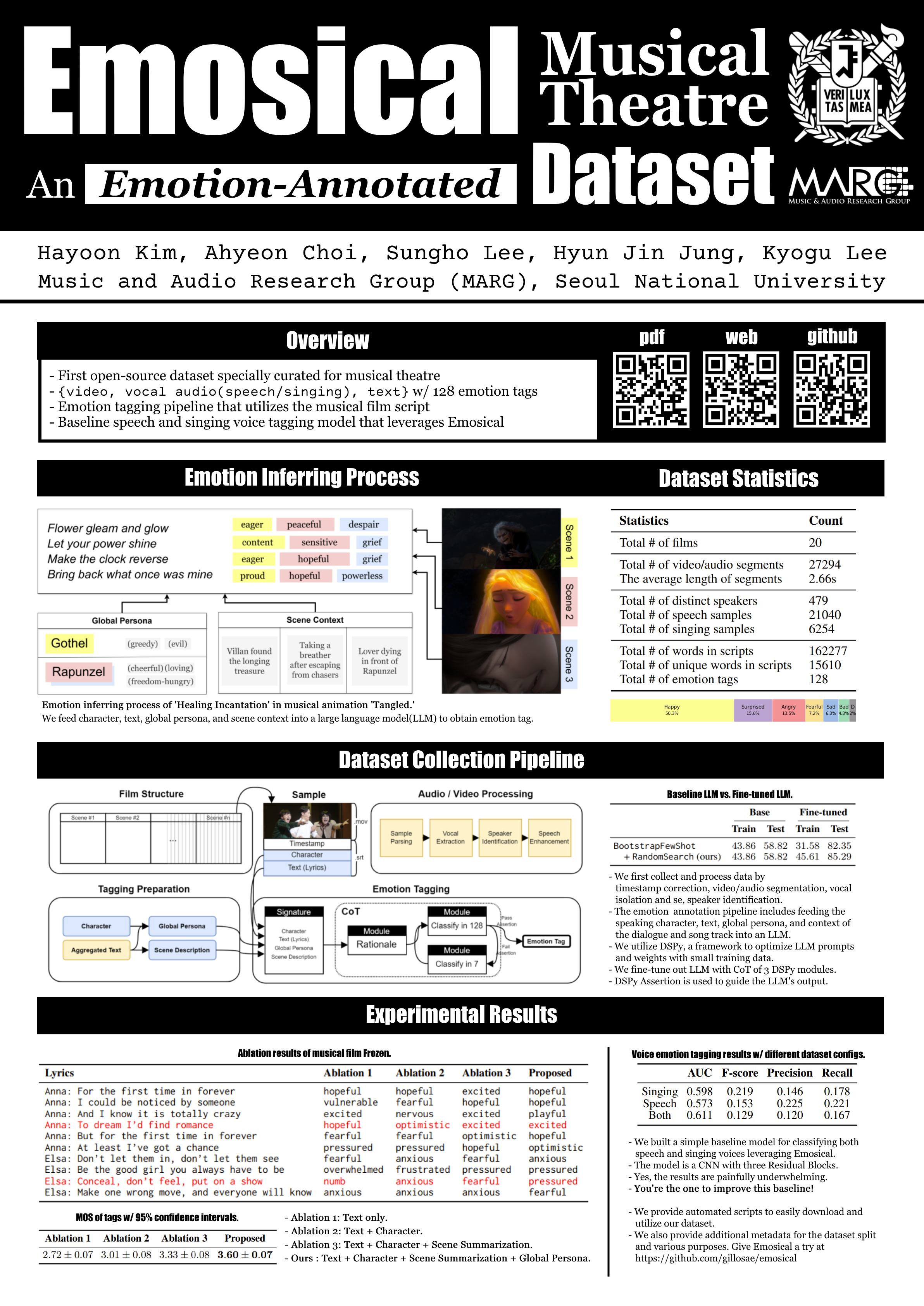 This paper presents Emosical, a multimodal open-source dataset of musical films. Emosical comprises video, vocal audio, text, and character identity paired samples with annotated emotion tags. Emosical provides rich emotion annotations for each sample by inferring the background story of the characters. To achieve this, we leverage the musical theatre script, which contains the characters’ complete background stories and narrative contexts. The annotation pipeline includes feeding the speaking character, text, global persona, and context of the dialogue and song track into a large language model. To verify the effectiveness of our tagging scheme, we perform an ablation study by bypassing each step of the pipeline. The ablation results show the usefulness of each component in generating accurate emotion tags. A subjective test is conducted to compare the generated tags of each ablation result. We also perform a statistical analysis to find out the global characteristics of the collected emotion tags. Emosical would enable expressive synthesis and tagging of the speech and singing voice in the musical theatre domain in future research. Emosical is publicly available at https://github.com/gillosae/emosical.